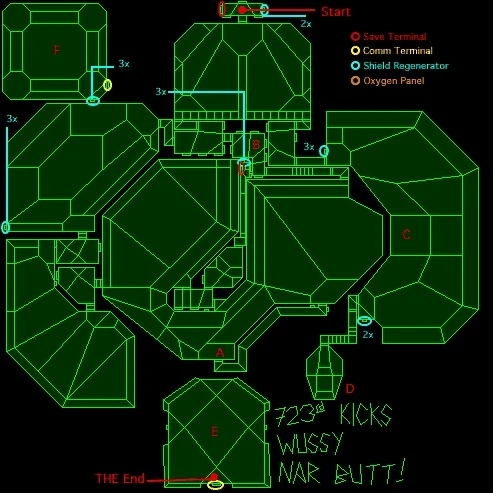 - When this map is opened in a map editor, a written message can be found outside the bounds of the level. It reads, "723rd KICKS WUSSY NAR BUTT!". "723rd" refers to the Pfhor's 723rd Aggressor Squadron that you fight in this level.