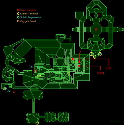 The first terminal is just around the corner from your starting location. After you've read, head downstairs and into the basement area where there is a pattern buffer and a 1x shield recharger. The water level will begin to steadily rise; this is unavoidable. Fortunately, an oxygen replenisher can be found nearby, if you take the south tunnel and then go west. There's also a 2x shield recharger next to the oxygen replenisher, in the southwest corner of the level.