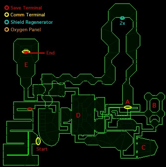 The level contains one pattern buffer near the beginning of the level. About halfway through the level, where a large northbound hallway makes a U-turn, a 2x shield recharger can be found.