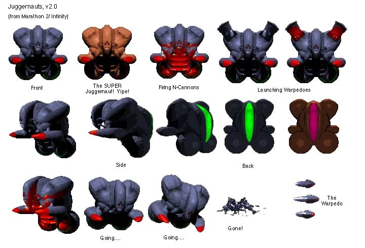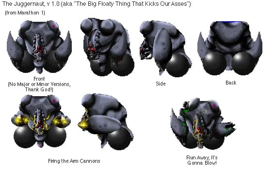 In Marathon 2: Durandal and Marathon Infinity Juggernauts are given a new look, new weapons, and they no longer prioritize their weapons based on the distance to their target. Juggernaut also come in Minor or Major versions.