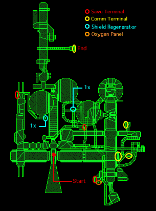 This is the exit terminal of the level. It contains a strange message from an unknown source mentioning "the peril of a thousand fates"; perhaps there a thousand alternate timelines, with events unfolding slightly differently in each of them. The message ends with "find yourself starting back" before you are sent to the next level, which takes place in a different timeline.