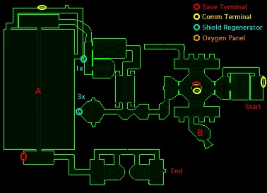 There is a pattern buffer a short distance to the west of the start room. Near the end of the level, beyond a very large hall with a narrow bridge leading across it, another buffer can be found. The level contains a 3x shield recharger to the west of the airlock in the center of the map. A 1x shield recharger can be found few rooms further to the north of the airlock.