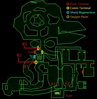 You can find a 1x shield recharger just to the northwest of the recreation area. In the alcove just south of the recharger, you can find a hidden door. Behind this you will find a corridor with another Magnum (picking it up allows you to dual wield Magnums) and some ammo (this is at the point marked B1 on the map). There's yet another hidden door here in the eastern wall (B2) concealing a secret terminal.