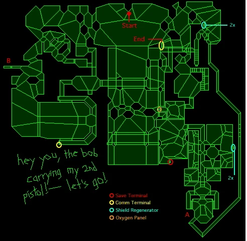 There is one pattern buffer in a room in the southeast part of the level. An oxygen replenisher can be found in the room north of the pattern buffer, and a 2x shield recharger can be found to the east of the buffer. Another 2x shield recharger can be found underwater in the northeast corner of the map, close to the start of the level.